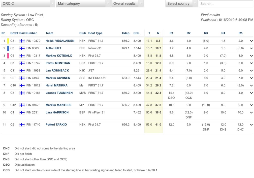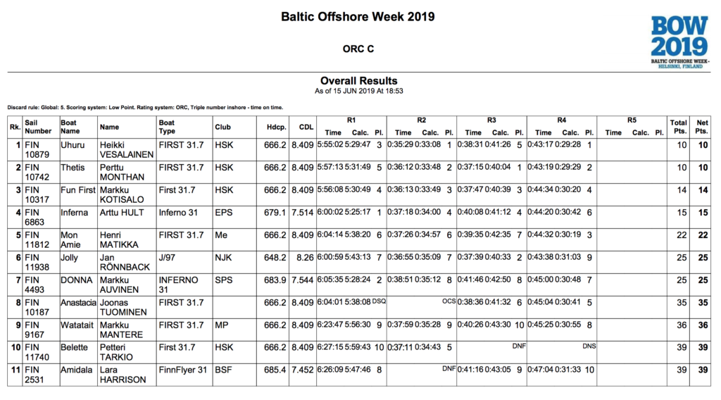 The first boats to finish the race was Group C having sailed 5 hrs 55 minutes to 6 hrs and 27 minutes. According to corrected time the winner of the 30.5 nM long offshore race in this group was Arttu Hult’is Inferna FIN6863 (Inferno 31) with a margin of 3 minutes and 7 seconds ahead of Markku Auvinen’ Donna FIN4493 (Inferno 31). Third place in this group went to Heikki Vesalainen’ Uhuru FON10879 (First 31.7).