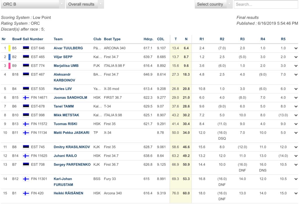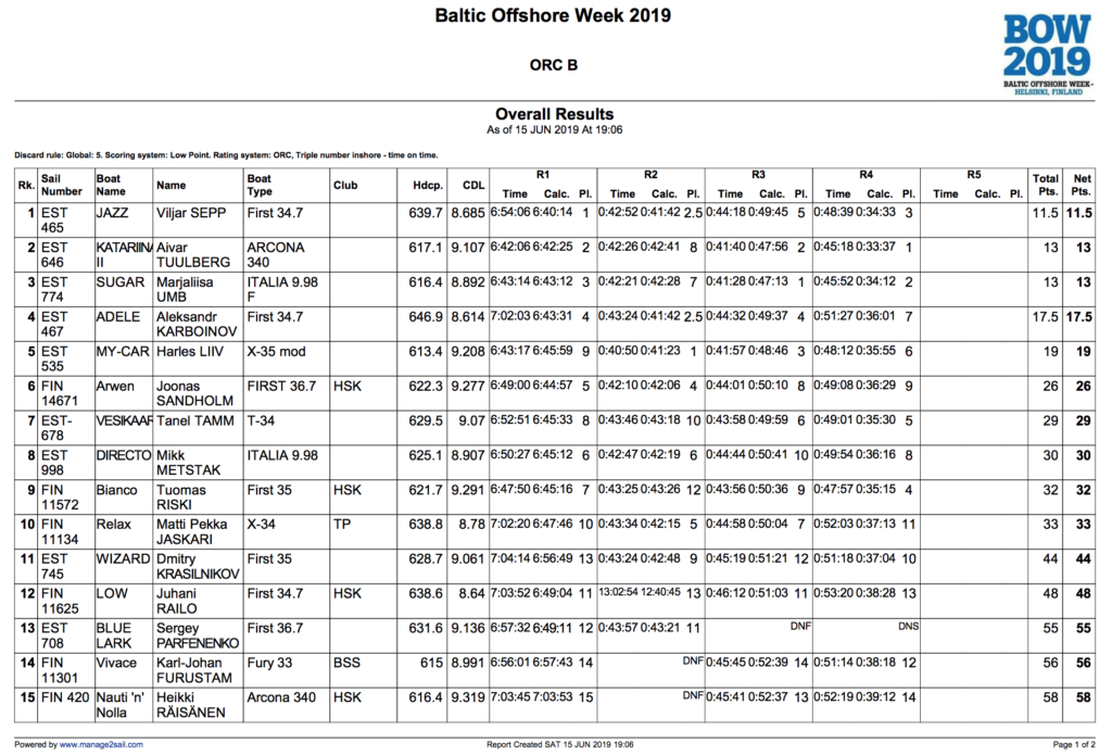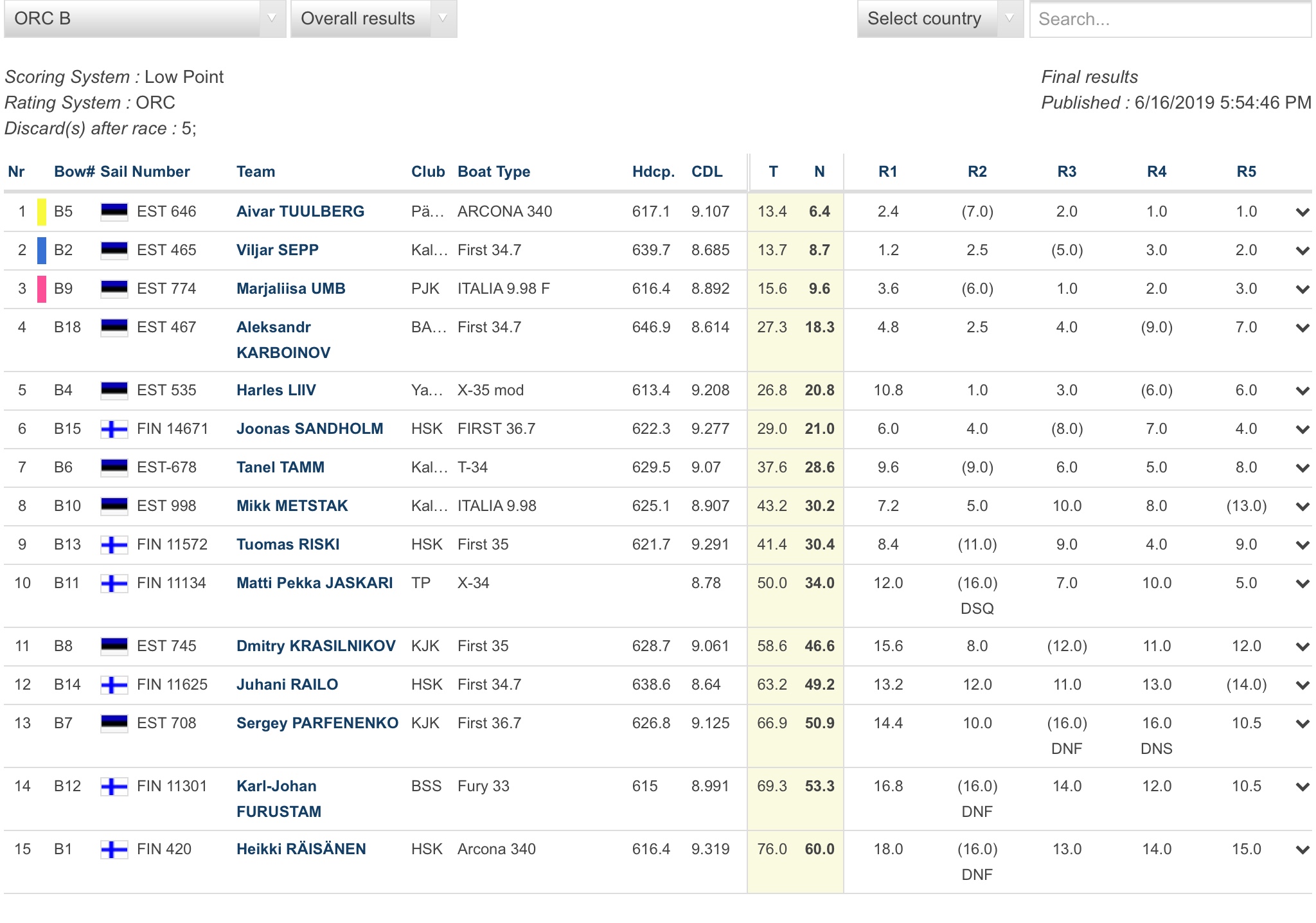 In group ORC B three boats to lead the race were Estonians – Arcona 340 Katariina II of Aivar Tuulberg, Italia 9,98F of Marjaliisa Umb and X-35 mod My Car of Harles Liiv. At the same time one of the slowest boats in the fleet by GPH, First 34.7 Jazz of Viljar Sepp sailed so well through the fog that managed to decrease the margins with the boats ahead of them and increasing with the ones behind them. The results on the Notice Board were in favour of Jazz EST465 who managed to precede Katariina II EST646 team by 2 minutes and 11 seconds. Sugar EST774 takes the third place from offshore race, 42 seconds behind of Katariina II.’