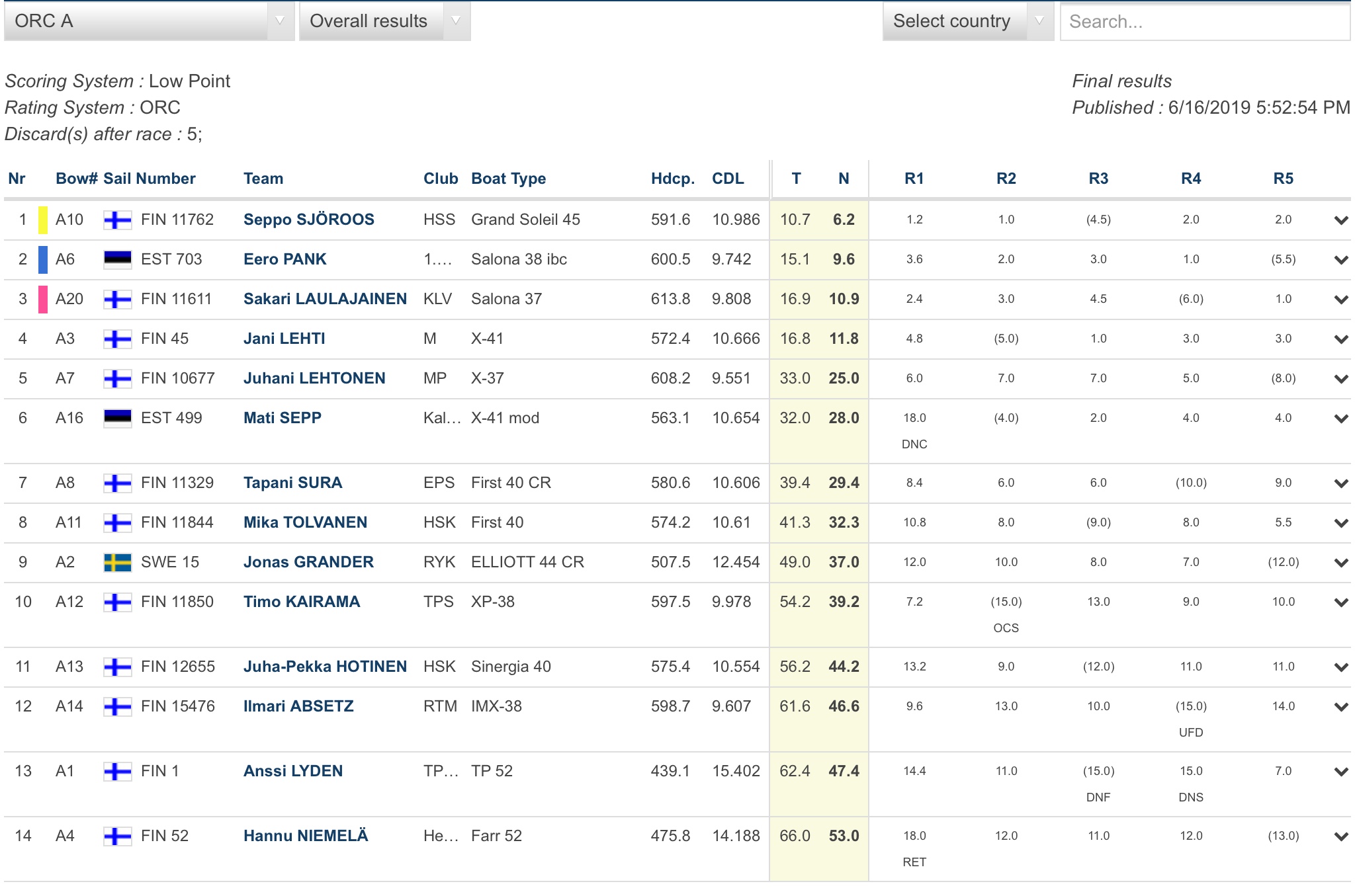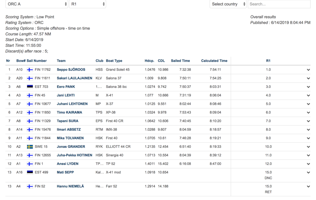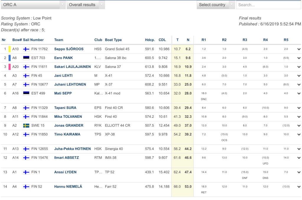 In group A the first boat to finish was TP52 Zer0Emission with Anssi Lyden after being sailed 6 hrs 16 minutes and 8 seconds. But in the corrected times the victory goes to Seppo Sjöroos Grand Soleil 45 Seanna FIN11762 with a 14 seconds margin ahead of Sakari Laulajainen’ Salona 37 Ramdata FIN11611. Third place in this group goes to Eero Pank’s Salona 38 ibc Credit24 Reval Café EST703.
