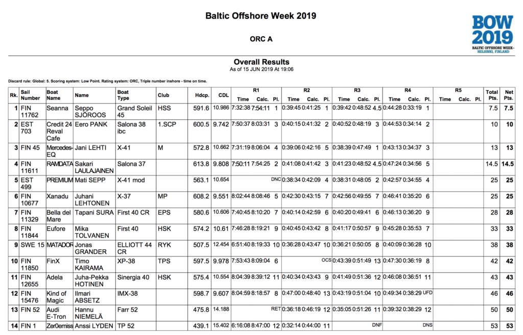 Baltic Offshore Week 2019 regatta which is also considered as the Estonian and Finnish ORC Championships, was kicked off with a 30-40-miles long offshore race in Helsinki, on Friday, June 14th. This regatta has been held yearly on the both shores of the Finnish Gulf since 2008. 39 offshore sailing teams – 28 from Finland and 11 from Estonia experienced a bit autumn-like nasty and wet weather. The wind and weather forecast betrayed the Race Committee led by Madis Ausman, being 180 degrees different what was the forecast. Arriving to the starting area in front of the Hernesaari, massive fog appeared on the sea preventing to start racing what was scheduled for 11 am.